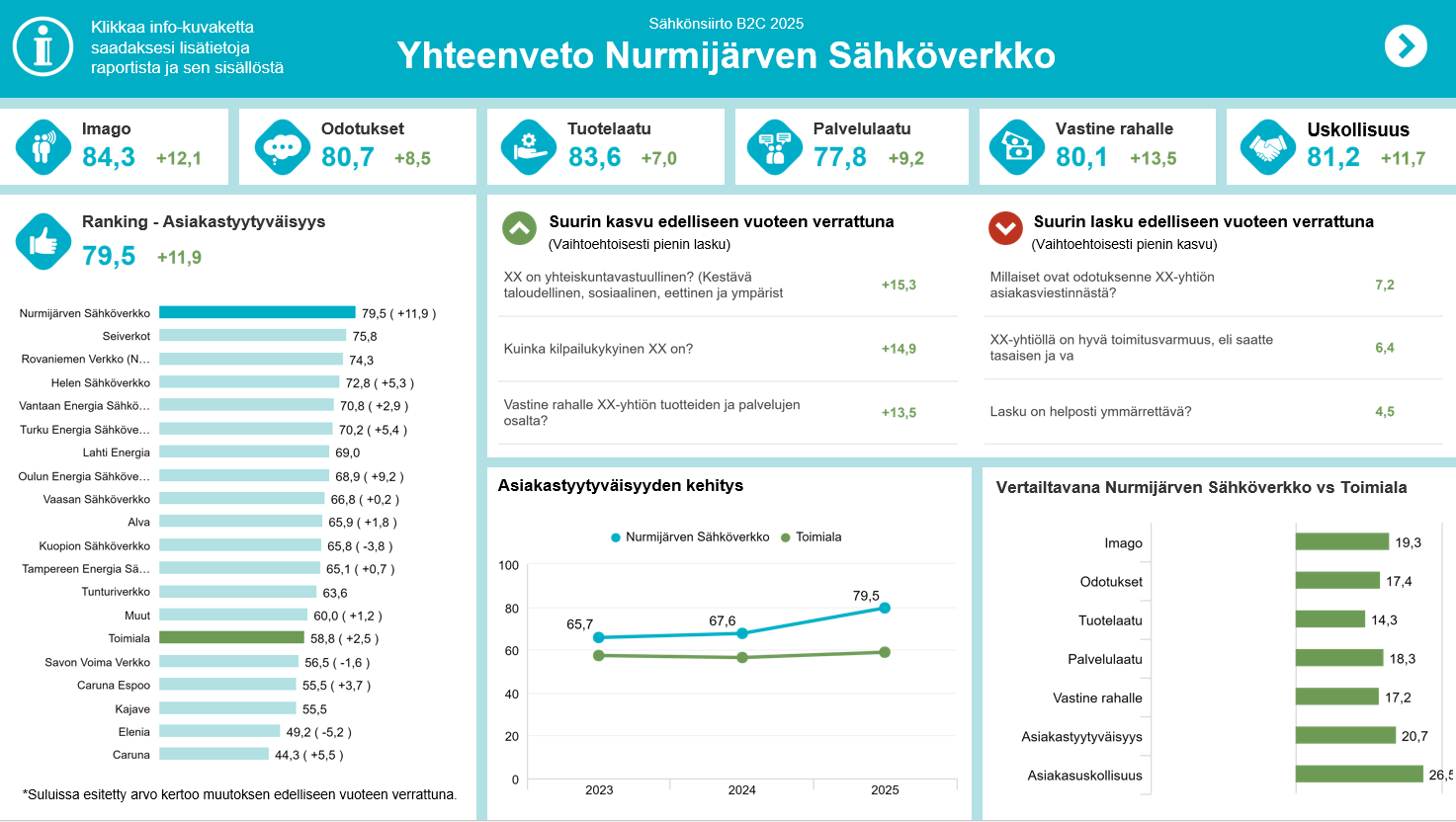 Nurmijärven Sähköverkko (79,5) paransi edelleen viimevuotista sijoitustaan ja nousi tutkimuksen ykkössijalle. Myös Seiverkot (75,8) ja Rovaniemen Verkko (74,3) vahvistavat asemiaan: näiden yhtiöiden palvelukokemusta kuvaa erityisesti tasainen toimitusvarmuus sekä selkeä ja ymmärrettävä asiakasviestintä. Kärkijoukkoon nousevat lisäksi Helen Sähköverkko (72,8) ja Vantaan Energia Sähköverkot (70,8), joiden tuloksissa näkyy parantunut asiakaspalvelun tasalaatuisuus.