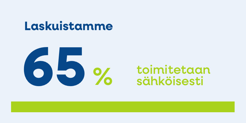 Laskujen sähköisyysaste jatkaa kasvuaan. Viime vuonna jo 65 prosenttia laskuistamme toimitettiin asiakkaille sähköisiä kanavia pitkin. Lähes puolet laskuista on henkilöasiakkaiden e-laskuja. Seuraavaksi suurin sähköisistä kanavista on yritysten verkkolasku 11,4 prosenttia ja kolmanneksi henkilöasiakkaiden digipostilaatikko Kivra 4,8 prosenttia. Paperilaskuja laskuistamme on vielä noin kolmannes.