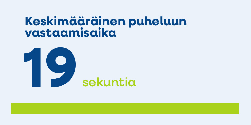 Asiakaspalveluumme soitettiin vuoden 2025 aikana noin 10 000 kertaa ja sähköisiä kontakteja oli noin 9 000. Asiakaspalvelumme keskimääräinen puheluiden vastausaika oli erittäin lyhyt, vain 19 sekuntia. Keskimäärin puhelut kestivät 3 minuuttia 49 sekuntia.